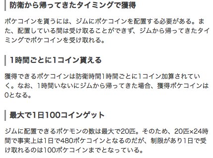 ポケモンgo攻略 Gamewith ポケコインの貰い方まとめ 防衛から帰ってきたら獲得 防衛1時間毎に1コイン 防衛1時間未満だと0コイン 1時間ごとにカウント 防衛は最大で匹配置可能 1日100コインまで ほぼ確定 T Co 8n0irpd4bm